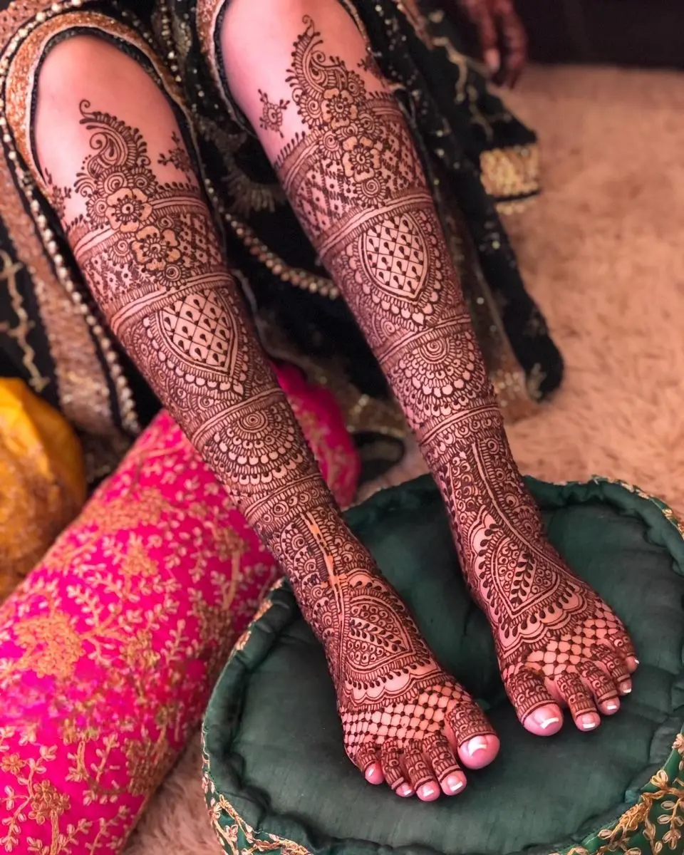 Make sure to tell your mehndi artist to draw around your legs and feet jewellery. You don’t want the mehndi to overshine the jewellery or hide the mehndi because of the placement of the jewellery. You want them to work together!